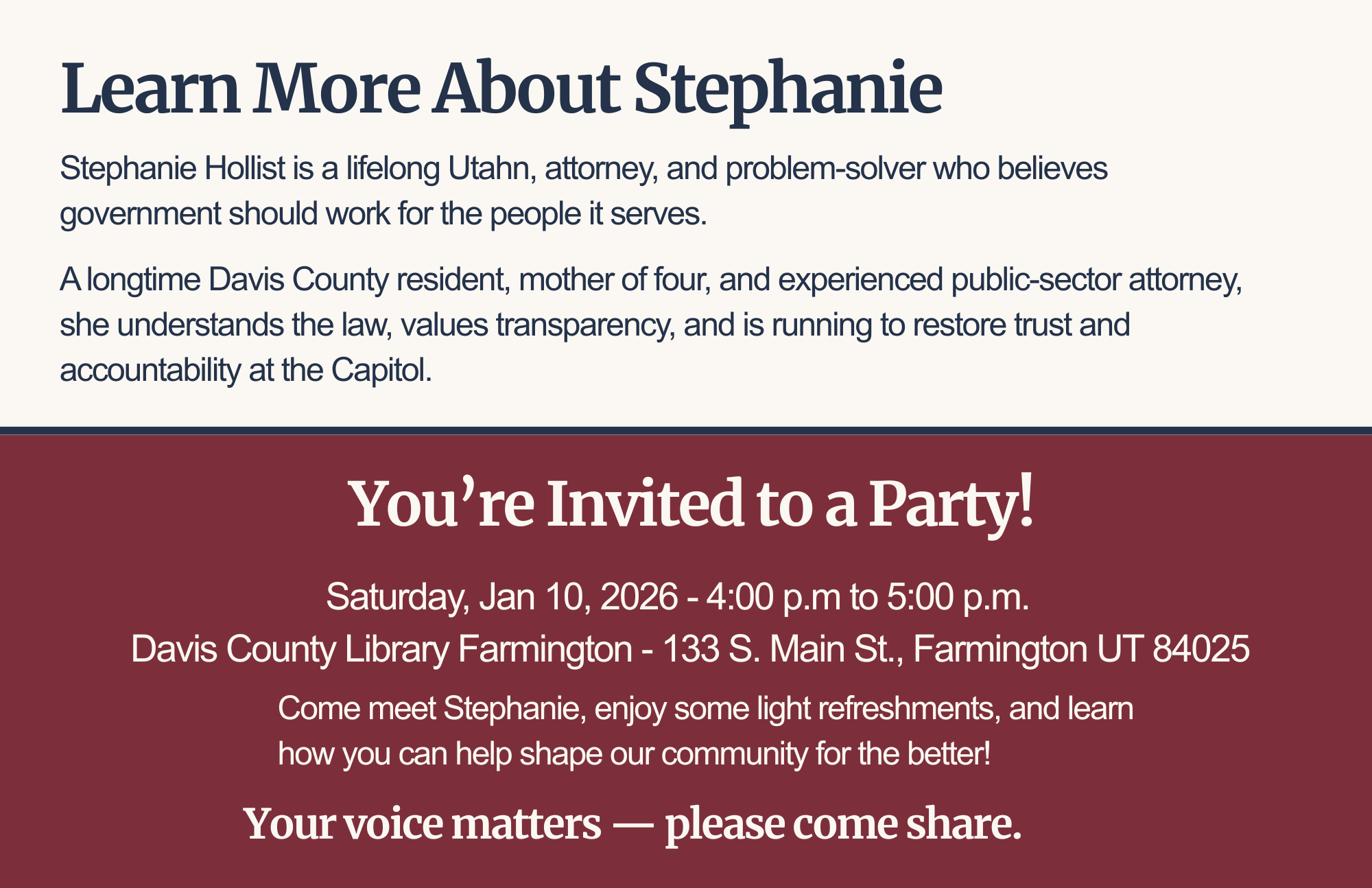 Enter your information below to follow along with my campaign journey and get updates on my campaign.